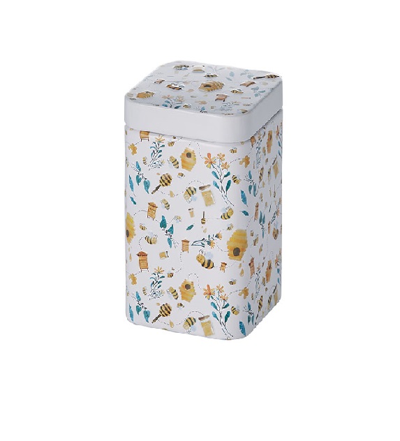 Deze kleine bewaarblik heeft een leuk kleurrijk ontwerp met bijen.
